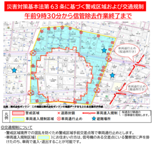 ・警戒区域手前交差点等での車両通行止め、および車両進入規制が実施されます。