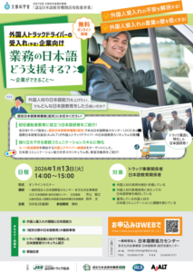 全日本トラック協会と日本国際協力センターでは、文部科学省事業を活用して、外国人トラックドライバー採用予定の事業者向けの日本語研修カリキュラムを開発いたしました。つきましては、外国人トラックドライバー採用予定の事業者向けにオンラインセミナーを以下の通り開催いたします。