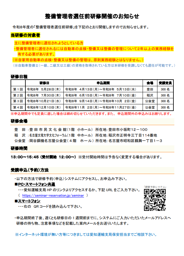 愛知運輸支局より令和8年度 整備管理者選任前研修開催について発表がございました。