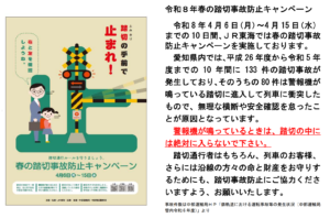 東海旅客鉄道株式会社(JR東海)では、令和8年4月6日(月)~15日(水)の10日間、春の踏切事故防止キャンペーンが実施されます。 踏切事故の多くは、無理な横断や安全確認を怠ったことが主な原因となっています。 踏切の手前では必ず一時停止をして目と耳で周囲の安全を確かめるとともに、踏切前方スペースの確認をしないまま前の自動車に続いて踏切内に進入しない」、「警報器が鳴ってからは踏切内に立ち入らない」等、踏切事故防止へのご協力をお願いいたします。