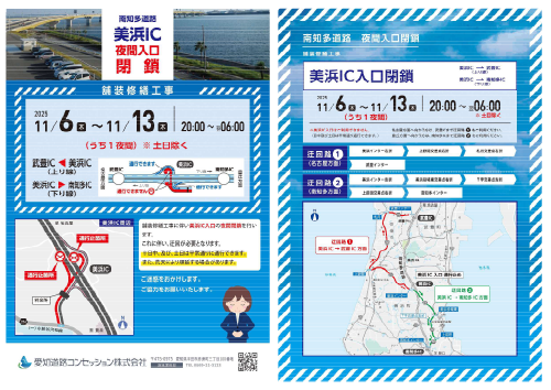 南知多道路 美浜IC付近における補修修繕工事に伴い、美浜IC入口が夜間閉鎖となるため、お知らせします。