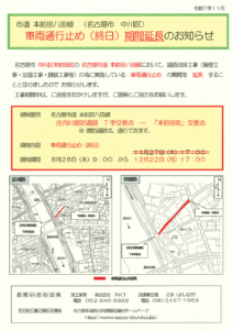 名古屋市道 本前田八田線において道路工事による車両通行止め期間を延長することになりましたのでお知らせします。