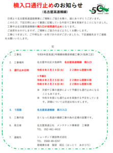 このたび、下記日時において工事を実施することになりました。工事中は名古屋高速楠線の楠入口が夜間通行止めとなります。