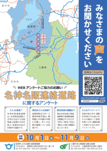 名神名阪連絡道路は名神高速道路八日市IC付近と名阪国道上柘植IC付近を結ぶ約30kmの調査中の高規格道路です。本道路の調査を進めるにあたり、住民の方々や道路利用者からの幅広い意見を把握し、道路計画へ反映させるために、以下のとおり「アンケート」を実施しますので、ぜひ皆さまの貴重なご意見をお聞かせください。