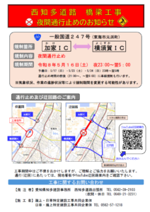 このたび、国道247号 西知多道路(東海JCT)の橋梁工事に伴い、複数日程にわたり下記のとおり夜間通行止めが実施されます。