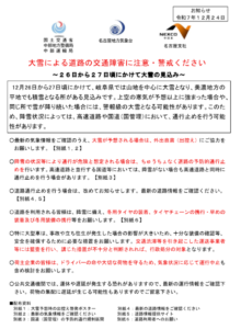 上空の寒気が予想以上に強まった場合や、同じ所で雪が降り続いた場合には、警報級の大雪となる可能性があります。このため、降雪状況によっては、高速道路や国道(国管理)において、通行止めを行う可能性があります。