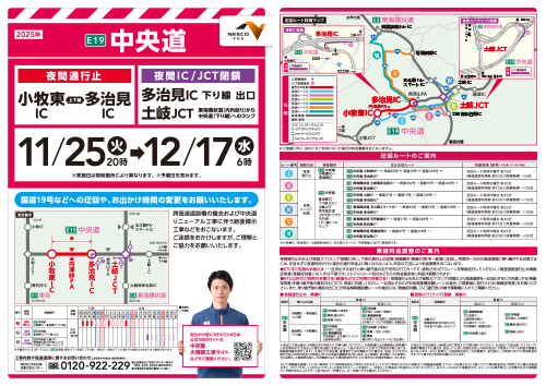 11月25日~12月17日まで断続的に、小牧東IC~多治見IC区間=夜間通行止め、多治見IC 下り線出口及び土岐JCT=夜間閉鎖。