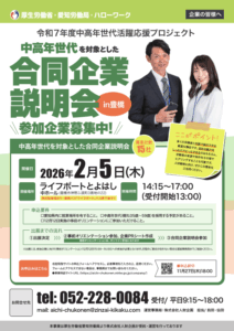愛知労働局では、中高年世代(35歳~59歳)の就職・転職に向けた取組として、合同企業説明会を開催いたします。 採用にお困りの企業様はぜひ、中高年世代人材の採用の機会としてご活用ください。