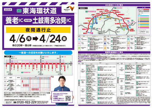 令和8年4月6日(月)~4月24日(金)の期間、東海環状道 養老IC~土岐南多治見IC間において、工事による「夜間通行止め」規制となるため、お知らせします。
