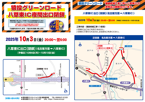 2025年10月3日(金) 20時から翌朝 6時まで、舗装修繕工事に伴い八草IC出口が夜間閉鎖となるため、お知らせします。