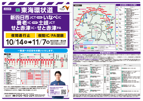 2025年10月中旬から下旬にかけて、東海環状自動車道の一部区間で、順次、「夜間通行止め」規制となるため、お知らせします。