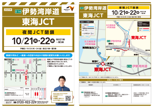 令和7年10月21日(火)及び22日(水)の各日、21時から翌朝5時まで、伊勢湾岸道 東海JCT が「夜間閉鎖」となるためお知らせします。