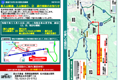 ■ 国道158号 奈川渡改良事業 新入山隧道、入山隧道➀、➁ 通行規制のお知らせ(11月10日~令和8年4月下旬終日) ![]()