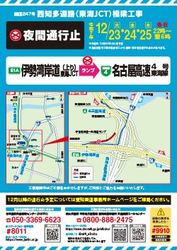 資料: 国道247号西知多道路(東海JCT)橋梁工事に伴う夜間通行止のお知らせ(12月23日(火)、24日(水)、25日(木)) ![]()
