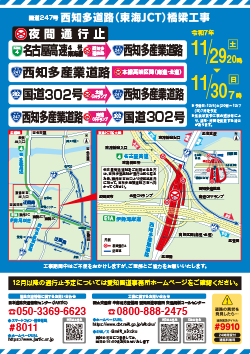 資料: 国道247号西知多道路(東海JCT)橋梁工事に伴う夜間通行止のお知らせ(11月29日~ 11月30日) ![]()
